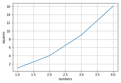 看看上面的代碼行,我們沒有給出一個數組,而是有兩個列表,它們分別成為我們的X軸和Y軸。這里你可以注意到,如果我們的x軸值是2,它對應的y軸值是4,也就是說,y軸值是x軸值的平方。