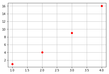 plt。繪圖([1,2,3,4],[1,4,9,16],“ro”)
