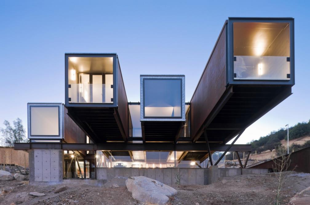 這種美景坐落在智利的巖石山坡上,就在圣地亞哥城外。雖然是用 1 2個海運集裝箱制造的,但很容易被誤認為是價值數(shù)百萬美元的豪宅。它的特點是一個被動通風系統(tǒng),利用從下面的溝渠的自然氣流冷卻房屋,使電子空調(diào)沒有必要。內(nèi)飾和橋接部件非常重鋼,內(nèi)部有一種時尚的現(xiàn)代感覺。