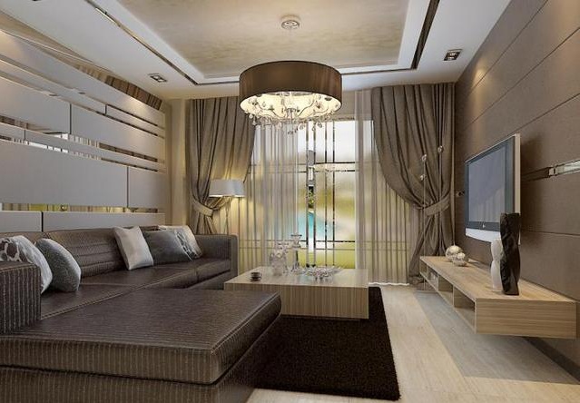 這款不銹鋼線條吊頂與整個家裝風格相一致,深灰色介于黑色之間,低調沉穩的氣質呼之欲出。雙層不銹鋼線條設計,層次分明,搭配與之風格相同的水晶吊燈,詮釋了一個時尚、冷傲、穩重的家居空間。