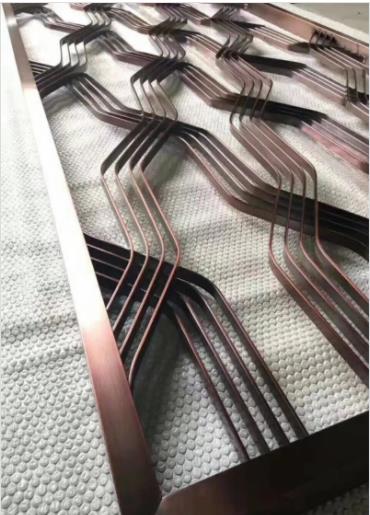鍍銅不銹鋼屏風與一般的玫瑰金不銹鋼屏風或是鈦金不銹鋼屏風前期加工工藝相同。后期工藝不同之處在于:一般的仿古銅不銹鋼屏風做拉絲處理,然后在鍍鈦時鍍青古銅或紅古銅,最后噴一些顏色特殊的黑漆作舊。