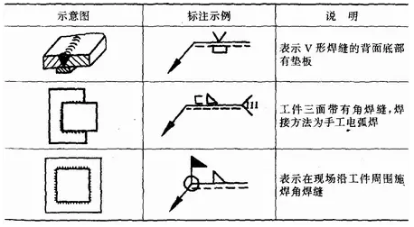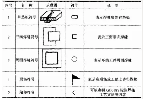 補(bǔ)充符號(hào)是為了補(bǔ)充說(shuō)明焊縫的某些特征而采用的符號(hào),見(jiàn)表1—7。應(yīng)用示例見(jiàn)表1—8。