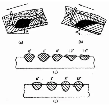 (a)下坡焊??(b)上坡焊??(c)下坡焊時(shí)焊件傾角的影響  (d)上坡焊時(shí)焊件傾角的影響