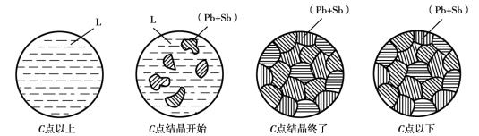 含Sb量低于11%的合金,其結(jié)晶后的產(chǎn)物為Pb+(Pb+ Sb)的組織,稱為亞共晶組織;含Sb量高于11%的合金,結(jié)晶后的產(chǎn)物為Sb+(Pb+ Sb)的組織,稱為過共晶組織。