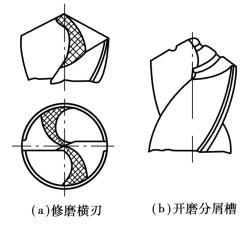 在實(shí)際生產(chǎn)中,為了克服麻花鉆的缺點(diǎn),常對(duì)麻花鉆進(jìn)行修磨,如圖5.2.29所示。修磨橫刃(圖5.2.29(a)),使橫刃變短,從而減少橫刃的不利影響;開磨分屑槽(圖5.2.29(b)),在加工塑性材料時(shí),能使較寬的切屑分成幾條,以便順利排屑。