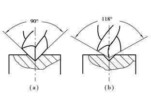 ②鉆孔易出現(xiàn)孔徑擴(kuò)大現(xiàn)象 這不僅與鉆頭引偏有關(guān),而且與鉆頭的刃磨質(zhì)量有關(guān)。鉆頭的兩條主切削刃應(yīng)刃磨得完全對(duì)稱,否則鉆出的孔徑就要大于鉆頭直徑,如圖5.2.27所示。而手工刃磨鉆頭不易磨得很準(zhǔn)確,因此應(yīng)選用直徑略小于孔徑的鉆頭鉆孔。