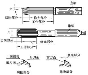 如圖5.2.32所示。手鉸刀為直柄,直徑范圍為φ1~φ50,其工作部分較長(zhǎng),半錐角φ角較小,導(dǎo)向作用較好,可防止手工鉸孔時(shí)鉸刀歪斜。機(jī)鉸刀多為錐柄,直徑范圍為φ10~φ80,可安裝在鉆床、車(chē)床、銑床和鏜床上進(jìn)行鉸孔。